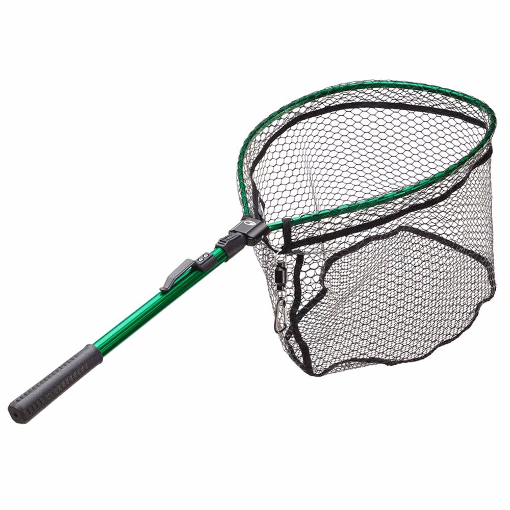Garbolino Magirus Faltschläger + Magnet – Aluminium, faltbarer Kescher mit gummiertem Netz. Forellen- und Leichtwild-Kescher mit Gumminetz, Karabinerhaken und Schnelllösemagnet sowie mit eloxiertem Aluminiumstiel, ideal für Bachspinning, Bellyboote und alle Gelegenheiten, bei denen kein langer Stiel erforderlich ist und ein kompakter Kescher benötigt wird. Dank seiner eloxierten Aluminiumkonstruktion wiegt dieser Kescher nur 270 g. Abgeflachte ovale Form, Griff mit rutschfester Gummierung. Das Netz vom Typ IZIFLOW besteht aus zwei Arten von gummierten Netzen: einem dünnen für den Boden, um den Fisch gut zu stützen, ohne ihn zu beschädigen, und einem dickeren an den Seiten, damit das Wasser schnell abfließen kann. Nach dem Schließen wird der Griff im Inneren des Netzes platziert. Geschlossene Länge: 47 cm.