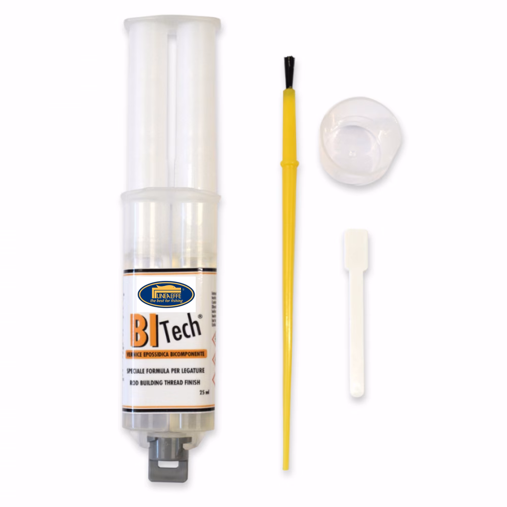 Colla bicomponente epoxy Lineaeffe per montaggio canne. La colla Lineaeffe Bitech è contenuta da una pratica siringa dosatrice da 25ml. La colla epossidica bicomponente è stata studiata per ricoprire le legature degli anelli per il montaggio delle canne da pesca in modo sicuro ed efficiente ed è ideale anche per la riparazione. Asciugatura lenta 24h, consistenza tipo gel.