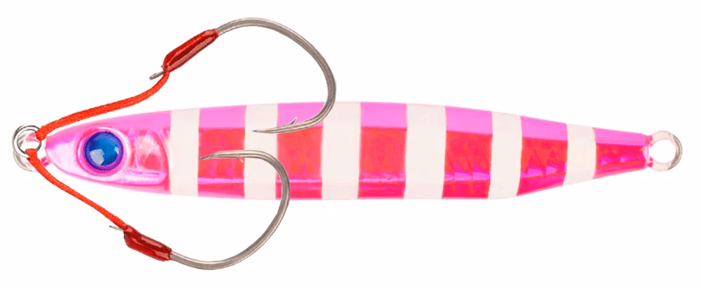 Mustad Mezashi BSJ Jig. When fishing vertically, fishermen will often struggle to keep the jig fishing right while battling the current. Mustad’s Mezashi BSJ (Beveled Slow Jerk) Jig is designed to react and move with the water, making this the best choice for fishing at an angle. This lure is center-balanced with a wide body built with a medium-hard lead alloy. A new addition to the Mezashi eye concept, the BSJ Jig features a transparent through-eye that refracts light, attracting game from afar. Tied to the front of the lure are two Mustad light wire assist hooks. Available in a total of 8 different pattern configurations and 5 different weights.