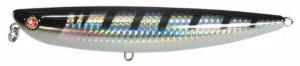Seaspin Pro-Q 145. Il Pro-Q. 145 della Seaspin è un walking the dog che forma curve strette e rapide se recuperato normalmente rispondendo molto prontamente alle sollecitazione del pescatore, mentre crea curve molto larghe se recuperato lentamente. Oltre al movimento laterale si distingue anche per un particolare movimento alto basso molto stimolante nei confronti dei predatori. Quest'ultimo movimento può essere favorito, o annullato, dall'azione del pescatore ed è comunque un'arma in più che distingue il Pro-Q. L'attenta distribuzione dei pesi e il profilo appositamente studiato permettono lanci molto lunghi. Il rattling è piuttosto sordo e prodotto dalle sfere interne parzialmente libere di muoversi. Per i colori si spazia dai naturali al trasparente, al glow. Non mancano anche qui armatura intera passante e le ancorette rinforzate. Indicato per la pesca saltwater per tutti i predatori che attaccano in superficie come spigole, pesci serra, barracuda, lecce e lampughe.