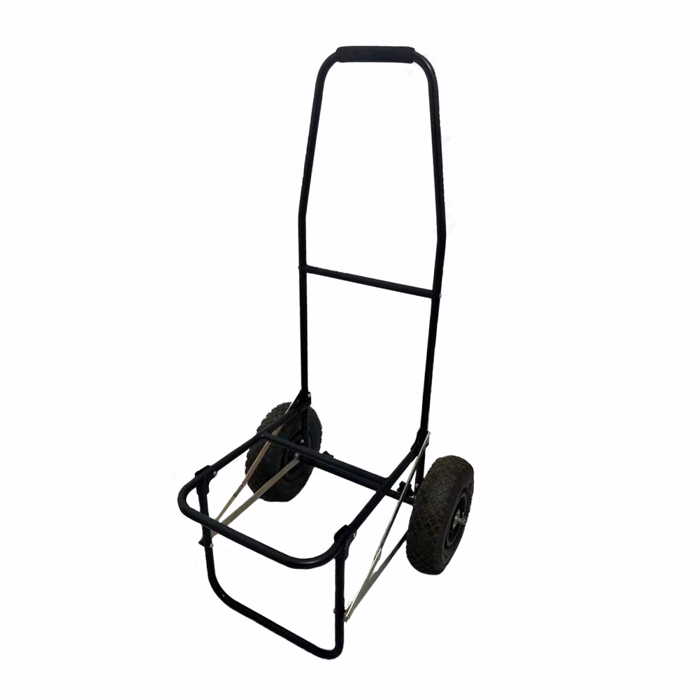 Sensas Club Trolley. Es handelt sich um einen sehr robusten Trolley, der speziell für den Transport von Angelausrüstung wie Sitzkiepen, Taschen und Ruten konzipiert ist, insbesondere im Zusammenhang mit dem Matchfischen oder anderen Arten des sportlichen Angelns. Das Design mit einem schwarzen Metallrahmen, zwei großen Lufträdern und einem Griff ist ideal für den Transport der Angelausrüstung, auch auf unebenem oder schlammigem Gelände.