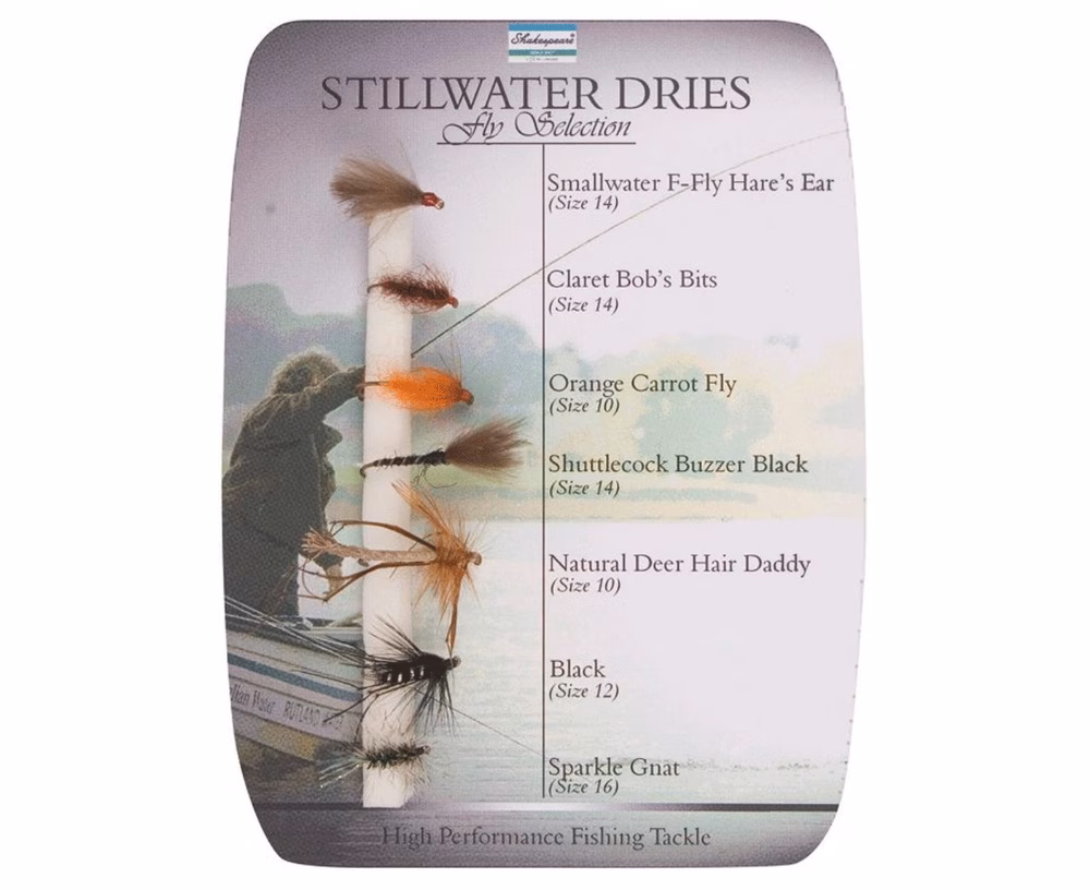 Shakespeare Sigma Fly Stillwater Dries. Ein Sortiment von Qualitätsfliegen zum Fliegenfischen, präsentiert in Blisterpackungen. Diese modernen Modelle wurden ausgewählt, um die höchste Variabilität zu bieten, die ein Fliegenfischer sucht.