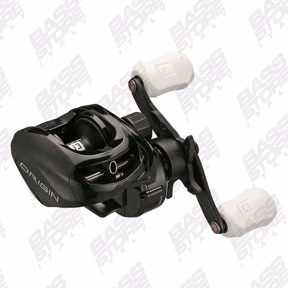 13 Fishing Origin A Casting Reel The Origin A is a modern low-profile baitcaster reel with unmistakable style that is designed for when you don't count on luck or coincidence for success on the water. Our proprietary Arrowhead line guide and 6-way centrifugal braking system deliver exceptional distance and control. This means more confident and accurate casts. Soft touch knobs ensure your bass thumb will stay comfortable all day. With a composite frame and 13 lbs of drag, the Origin A embodies the strength and durability you require. Left handle.