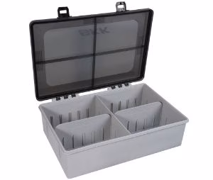 The internal structure is completely modular, offering the possibility to customize the layout of the compartments according to your specific needs. The system has been developed to perfectly accommodate other boxes from the BKK Armor Point line, creating an integrated storage ecosystem. Whether you need to store large treble hooks or small finesse hooks, the system adapts to your fishing style.
