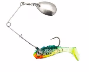 Creme Lure Spoiler Spin, rotating spoon combined via arm, in the form of a spinner bait for light games, to a holographic rubber shad. It works both for trout spinning in streams and for chub or perch fishing in lakes. Effective throughout the water column, it combines two different colors and vibrations and can be recovered at different recovery regimes. Excellent castability for a very versatile bait.