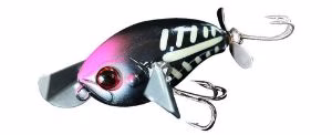 Jackall Bros Micro Pompadour crawler: a pure topwater, Noisy Bait. The rear prop makes a complex water current and noisy sound on the surface. We decreased line trouble by steady rear prop and double hook. Unique metal wings. The custom metal wings can crawl on the surface very well. When you try straight retrieving, it makes a big wave. And it can also make a ripple on the surface when shaking.