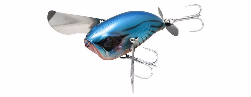 Unmatched in attraction and originality, the Jackall Pompadour provides a one-of-a-kind topwater presentation that fish won't be ready for. Designed to tempt bass at the surface, the Jackall Pompadour is fitted with metal wings that collapse on the cast and then flare out once they hit the water. Made to move tons of water, the flapping metal wings create a noticeable splash and a unique sound that compliments the dual rattle chambers. At the rear, the Jackall Pompadour features a free-swinging hook holder and a prop blade that generate a heavy gurgling attraction. This forward-thinking design not only creates additional disturbance, but it also eliminates the possibility of a bass using the lure as leverage to spit the hook.Offered in a number of classic color ways, the Jackall Pompadour has a big presence that will draws even bigger bites.