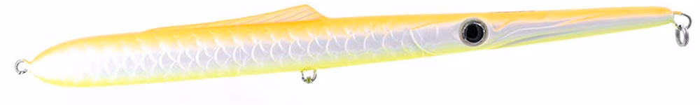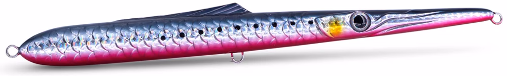 The Jatsui Drake needle-lure is an imitation garfish lure that moves as a topwater bait with a disorderly surface movement. It comes in a wide choice of colours, ranging from natural to the most visible even in low light conditions. The Jatsui Drake saltwater lure was born for bluefish and barracuda fishing and has a special external finish: the Jatsui Drake needle has raised scales and is made of ABS with metal wire running through it. This Jatsui lure is produced in three different sizes. Jatsui Drake 210, Drake 150 and Drake 120 mm.
