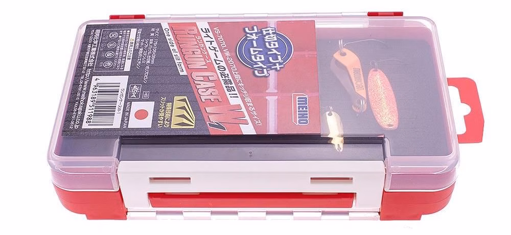 Meiho Rungun case W1 is a very convenient box for trout area, light game, bass fishing. It is double sided, with foam on the side where you can insert: trout waves, jigs, hooks, spoons, etc. etc. the other side is equipped with nine dividers.