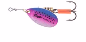 Mepps Aglia Fluo spinner. The special feature of Fluo palettes is that they become visible under the action of ultraviolet rays. These are the rays that penetrate the deepest part of the water. So, while all other visual signals are switched off, the Fluo paddles, excited by the UV rays, continue to emit and stimulate the attack. Their use is particularly effective in murky waters, overcast conditions, twilight and fishing at great depths.