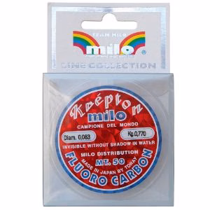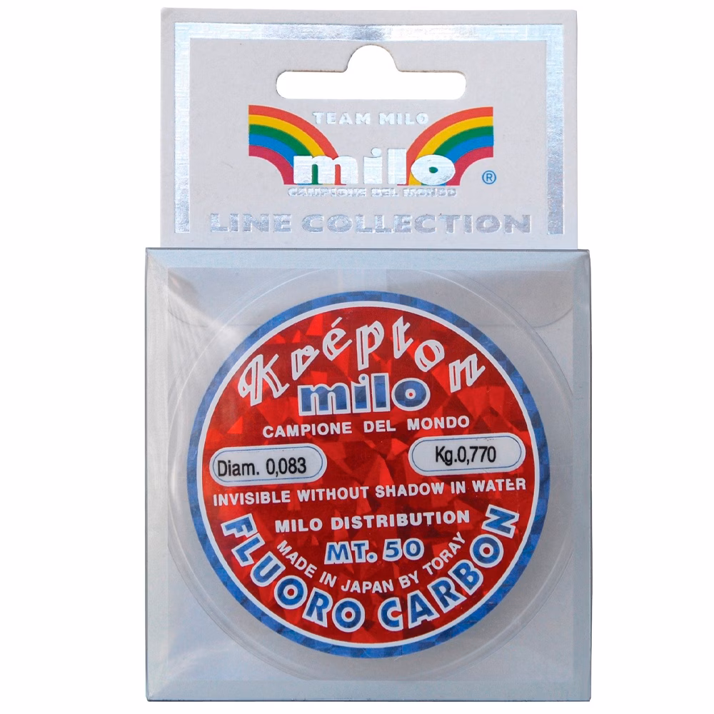 Milo Krepton fluorocarbon. Extremely soft Milo fluorocarbon thread, characterised by high abrasion resistance and absolute invisibility. This thread sinks quickly without absorbing water, has superior UV resistance, and is therefore able to maintain its characteristics over time and in all fishing conditions and temperatures. The diameters are strictly controlled and guaranteed, 50 metre reels. A very popular line among match-fishing specialists for making leaders for poles, bolognese, feeder and waggler fishing.