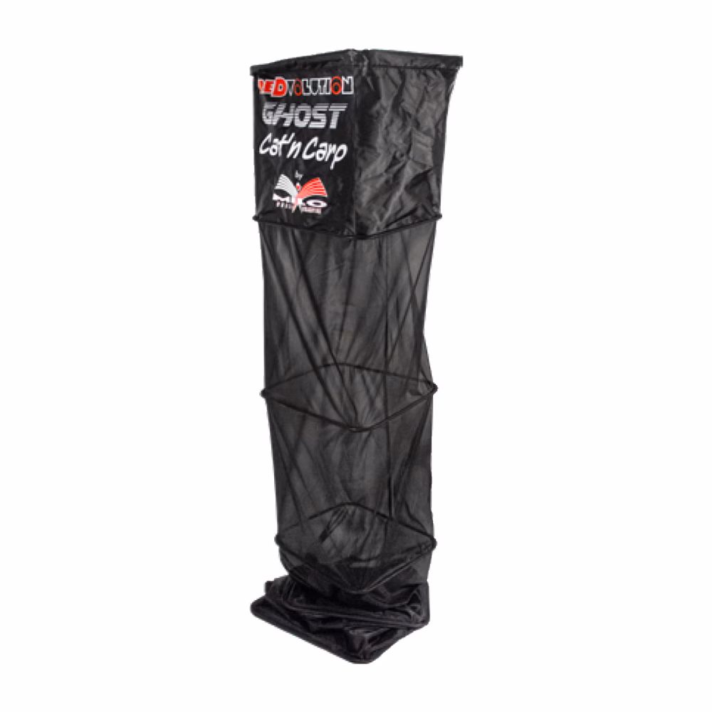 Milo Redvolution Ghost Cat'n Carp keepnet. Made from a soft, next-generation technical cotton fabric, this rectangular keepnet features an ultra-fine mesh that protects the fish from damage and prevents species like cat fish and carp from getting caught in the net with their ventral and dorsal fins. A double padding adds extra strength to the bottom section and provides maximum reliability when lifting the keepnet full of fish from the water. The angle lock with standard screw thread can be adjusted over 180 degrees.