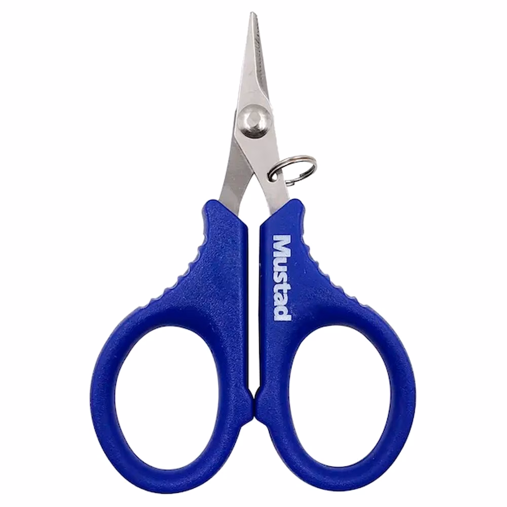 Mustad Braid Scissor. Perfect for cutting braided line, monofilament, and fluorocarbon, these shears are built of stainless steel and feature a serrated cutting edge. Features a built-in ring for attaching to a lanyard so it's always close by and at the ready.