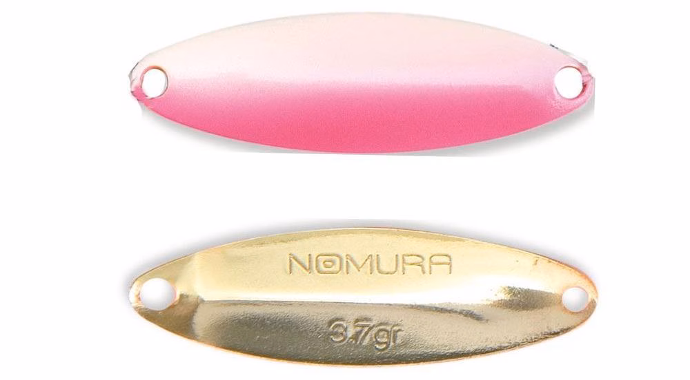 Nomura Isei Riu . Spoon from Trout Area by Nomura fishing lures. Multicolor Nomura undulating rods specific for trout fishing in ponds. Rigged with single barbless area game hooks.