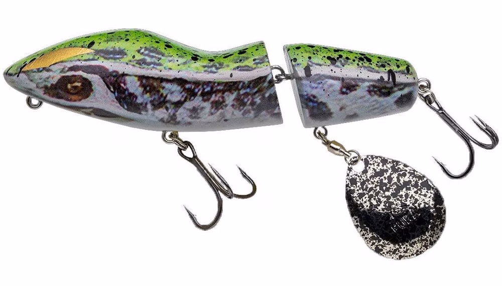 The Nories Joint Fuka Bait is a 127 mm and 44 g top water lure that introduces the vertical vibration category. It features a jointed ABS body designed to generate sound waves and a perfect balance to attract large bass and pike that usually distrust surface lures.