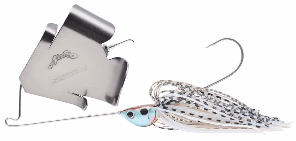 The Nories VOLCANO GRIPPER is a buzzbait equipped with a big-sized 4-fin "gripper blade". The original design of the distinctive blades produces a powerful water bite. The VOLCANO GRIPPER is also characterized by a strong water push and a large undertow that has never been seen in buzzbaits before. The strong lifting force enables a surprisingly slow retrieve. This allows the anglers to target bass in deep water that conventional buzzbaits could not attract, as well as bass deep in cover that could not be made aware of the appeal of conventional buzzbaits. The short arm "volcano" style effect and the ability to pull the lure more slowly also makes hooking the lure more probable. This VOLCANO GRIPPER can be used in the mid-summer doldrums when all lures feel helpless, or in the fall turnover season.