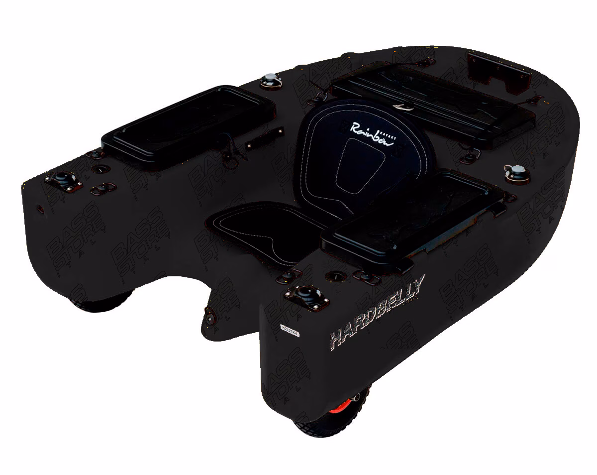 Rainbow Kayaks Hardbelly HARD BELLY is the first belly boat made of rigid material (polyethylene) molded with the rotational system and is unsinkable thanks to its newly developed structure, very similar to modern kayaks, with a hollow interior. Hard belly is ideal for rental by sport fishing facilities and fishing guides, as it is not subject to punctures and unwelcome injuries following incorrect or excessive use. Ideal for bass fishing, it also finds space for fishing in other fishing environments such as the lagoon or the sea, thanks also to the possibility of being customizable with an electric motor. Great attention is also paid to the on-board electronics thanks to a double transducer positioning system, both classic and with 180° lateral vision. Accessible (with rear seat lowered) on cars from the medium sector upwards. (cm 99x135x33; kg 23) The hard belly will be available in 3 versions: