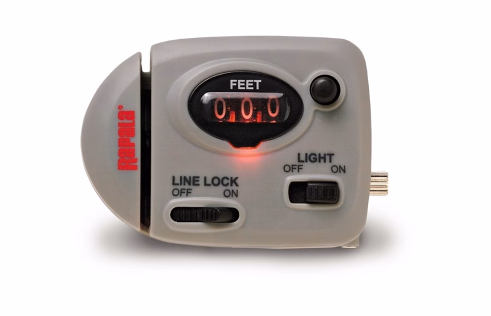 Rapala Lighted Line Counter. The Rapala Lighted Line Counter is a counter for fishing at controlled depths and distances while trolling or vertically. With this line counter you will be able to set your bait at the right depth every time, keeping you in the strike zone for better success. The illuminated display measures in feet and is easy to read in low light or night fishing conditions. Attaches to most rods with its durable, padded adjustable screw clamp. Accurate to 999 feet with minimal wire slippage. Reset button, line lock and automatic line release that activates when the fish strikes.