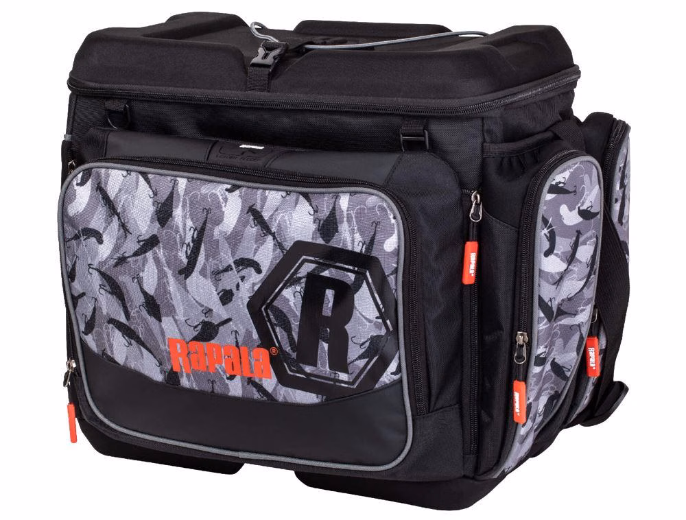 Rapala LureCamo Tackle Bag Magnum . Rapala Waterproof Fishing Bag Made of printed fabric with molded, waterproof EVA bottom and lid to protect from water. It houses seven Plano 3700 style tackle boxes inside the bag and has a top opening for quick access. The multi-layered front pocket features a secure stash that opens wide for easy access, zippered dispenser pockets and organizer pockets.