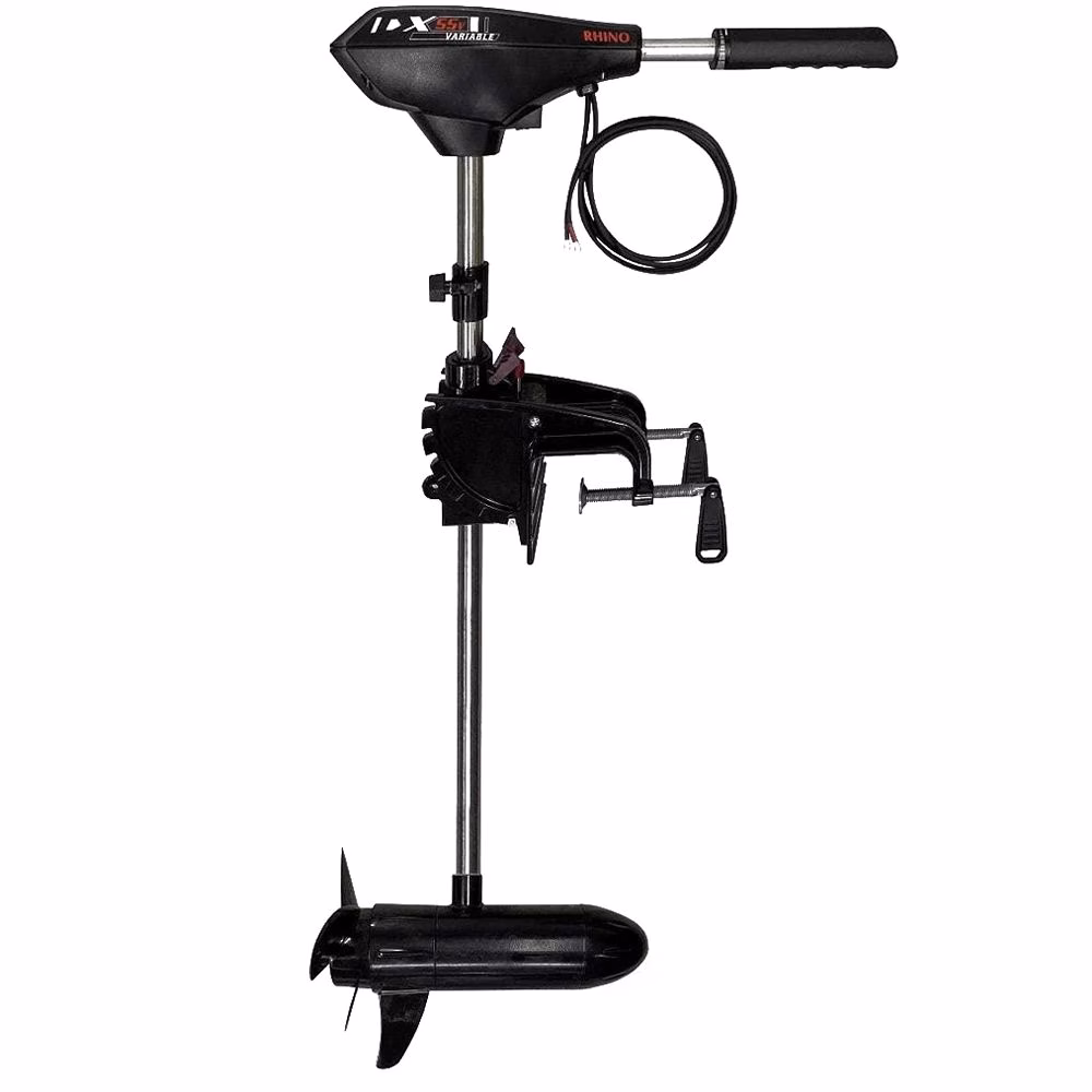 Rhino DX V fishing Trolling Motors. The Rhino DX V is a Rhino electric motor equipped with a variable speed drive that allows the speed to be adjusted to suit the needs of the moment. It can be installed on the transom of a dinghy, boat or kayak. It features a digital display that shows the battery voltage directly, with no more risk of unexpected battery depletion. Under the head it has a USB port to which a phone or other electronic devices can be connected. It has a reinforced motor block and a stainless steel stem; making it more resistant to shocks and stress.