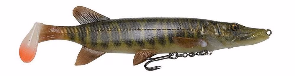 Savage Gear 4D Pike Shad. Based on a 3D Scan of a real baby pike with perfect details, Photo Chrome skin print and added DNA scent! The small jacks are in periods the favorite prey for Big pike and these super realistic lures will be deadly! The belly-mounted treble hook is attached to a swivel, making it very difficult for a pike to throw the hook during a fight. The paddle tail makes the lure rock seductively and the rattle in the tail sends out provoking clicks