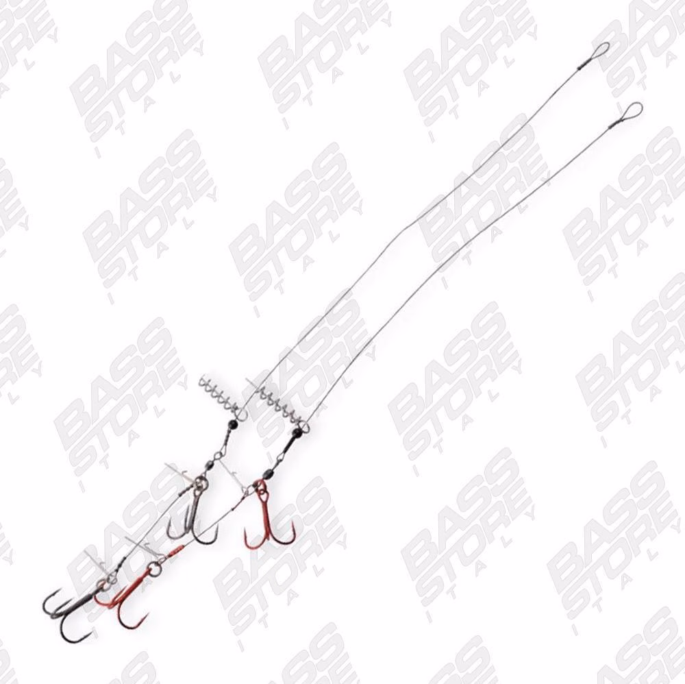 Savage Gear Corkscrew release Rig. A perfect hook-up and landing rate, combined with a soft lure preserving “release” rig – same principle as our Line thru system – where the pike cannot use the weight of the lure to throw the hook! The lure will slide up the trace, away from the destroying pike teeth and land you many more fish! • Carbon49 stinger wire • Ultra sharp SG Y-trebles, 1 Red, 1 BLN • Corkscrew and belly spikes included • Strong forged splitrings