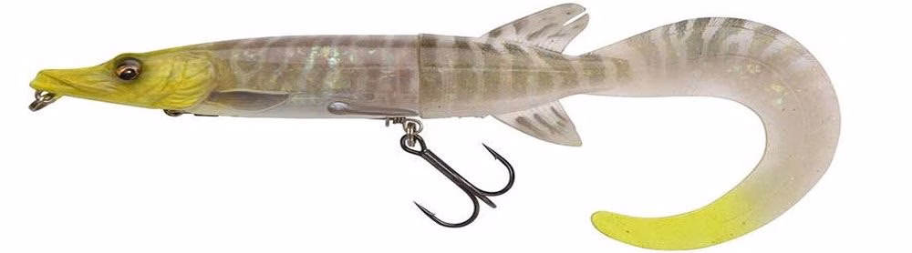 Savage Gear SG 3D Hybrid Pike, swimbait with rigid body and grub tail. 3D Hybrid Pike is a super realistic pike imitation with a soft curl tail that produces vibrations even when retrieved slowly. When the tail is screwed down, during the retrieve the "upward force" will push the head of the bait downwards, while when the tail is screwed up, the force will tend to hold the bait on the surface with the head up - so the swimbait comes to the surface and slides right under the surface creating a wake effect. The treble release system will make the fight with the predator safer thanks to the very resistant swivel incorporated on the ring. A replacement tail is included in the package.