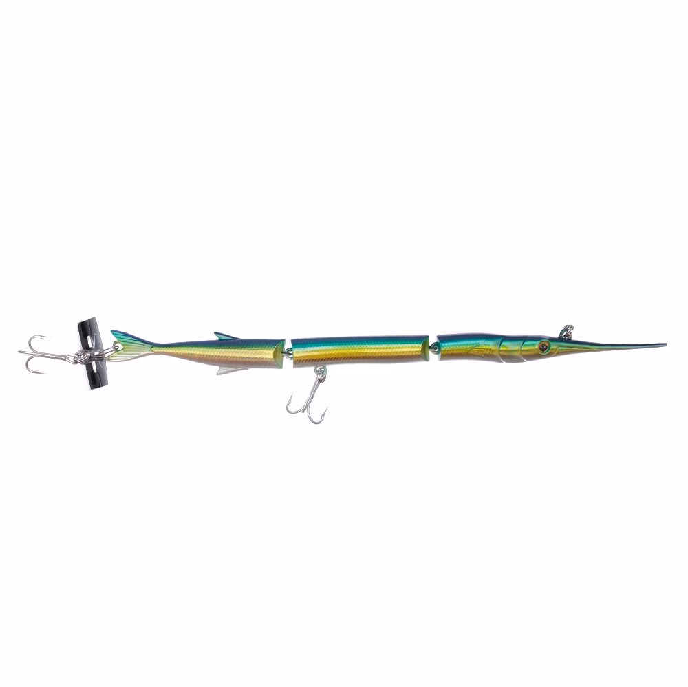 The Needlefish is an articulating body lure. It mimics one of the favorite prey of trophy Snook, Speckled Trout, Leerfish, Blue Fish. Features stainless hardware and corrosion resistant VMC hooks.