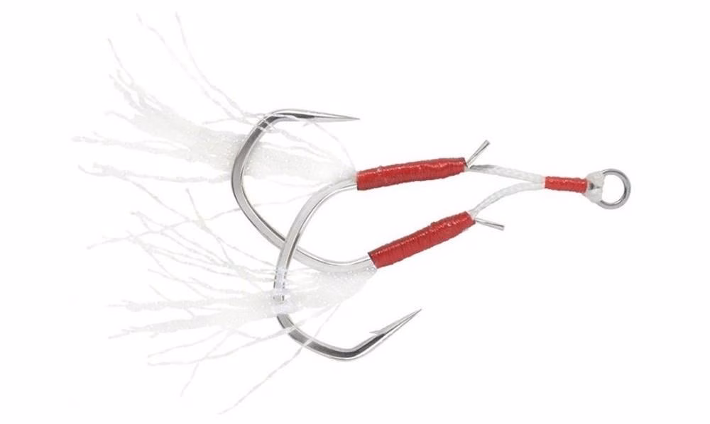 VMC 7117AH Slow Jigging Assist hooks. Assist Hook Vmc mounted with a rather short assist line and solid ring, in addition to the tuft of crystal flash. It is a spade hook with a square and robust wire with a wide curve and a shank with a rather particular shape to unload the weight and load of the prey on the lower corner. Saltwater assist hooks VMC with hooks dedicated to slow jigging - slow pitching lures
