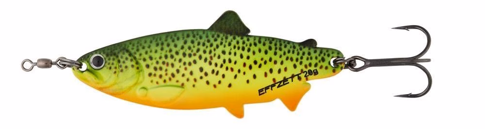 The EFFZETT® Trout Spoons are the awaited and demanded follow up on the new and innovative metal lures EFFZETT® Roach Spoon and Perch Spoon which were brought into the game and onto the market for the 2020 season! The Trout Spoons are following the concept of the Roach and Perch Spoons, with the result of a totally unique design which is based on the real body shape of a trout. The unmistakable flanking action perfectly imitates a dying or wounded fish in the water. The look of these nicely designed zinc metal lures will drive predators totally crazy: using state-of-the-art photo-printing technology, these lures come in a very natural look with incredible colors and details. The EFFZETT® Trout Spoons are available in 5cm/5g, 7cm/13g and 9cm/25g. This makes them the perfect prey of all predatory fish. The combination of size and weight of these lures makes them ideal for fishing in shallow water or over weed beds. Their great casting ability makes them perfect for shore anglers who can’t use a boat: Next to the natural Rainbow Trout color, the EFFZETT® Trout Spoons are also available in bright and visible colors such as Brown Trout, Fire Trout and Albino Trout, providing the right color for every situation.