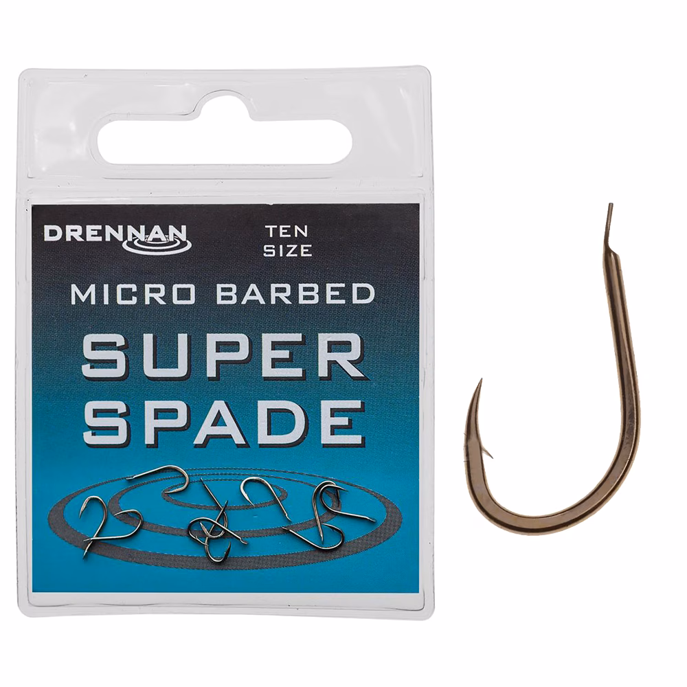 The Drennan Super Spade Hooks are a perfect pattern for the big fish angler and have a micro barb with a very strong medium shank.