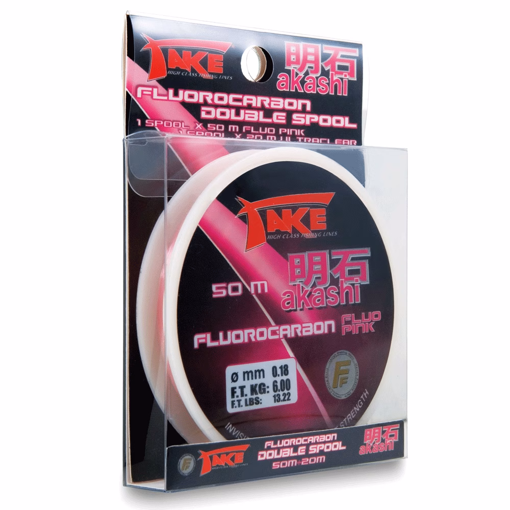 El hilo de pesca Ferrari Take Akashi Fluorocarbon Double Spool, la elección perfecta para los pescadores que buscan un hilo de pesca de fluorocarbono fiable y resistente. Este pack incluye dos bobinas de fluorocarbono, una de 50 m de hilo de color rosa y otra de 20 m de color ultra transparente, ideal para hacer invisibles en el agua los bajos de línea. El sedal tiene una excelente resistencia a los nudos y a la abrasión y es prácticamente invisible, perfecto para usar tanto en el mar como en agua dulce.