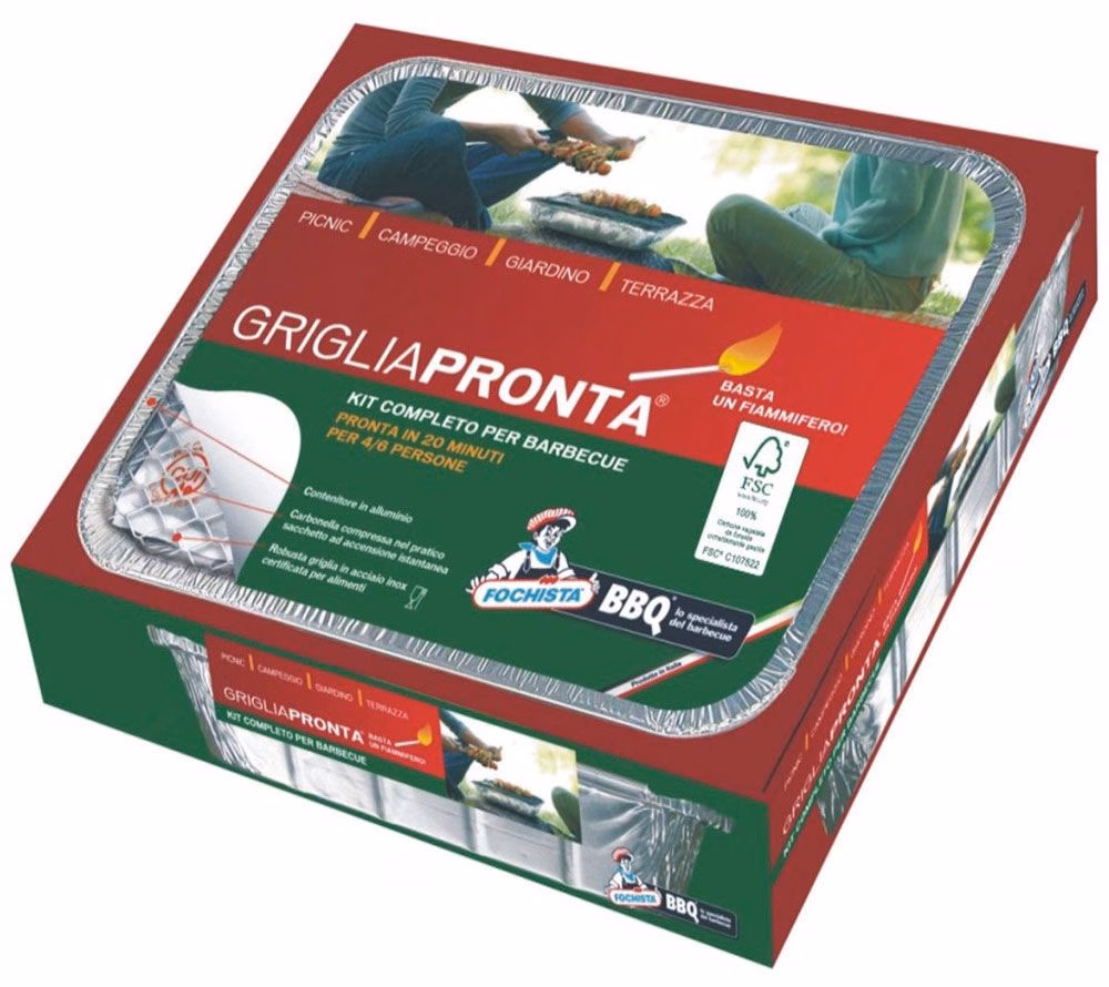 Fochista Griglia Pronta KIT COMPLETO PARA BARBACOA. Carbón de encendido instantáneo, recipiente de aluminio, parrilla certificada para alimentos. Lista en 20 minutos. Basta con una cerilla. Sacar la parrilla lista del recipiente de cartón. Retirar el soporte metálico y colocarlo sobre una superficie plana e inflamable; a continuación, colocar la parrilla lista sobre el soporte. Encienda el envoltorio de papel en las cuatro esquinas, a través de la parrilla, con una simple cerilla. Espere unos 20 minutos para obtener unas brasas adecuadas para cocinar (debe formarse una fina capa de ceniza). Las brasas durarán unas 2 horas, lo que le permitirá preparar comida para 4/5 personas. Se recomienda controlar la comida durante la cocción y darle la vuelta regularmente. Enfriamiento.