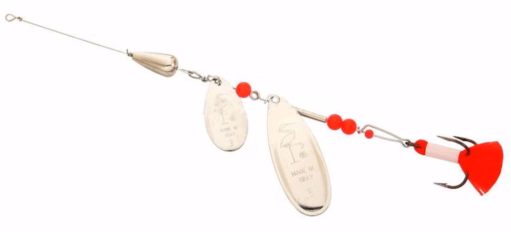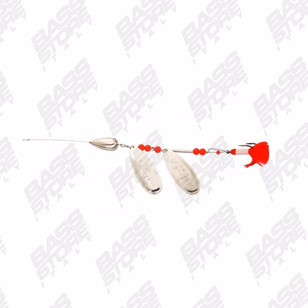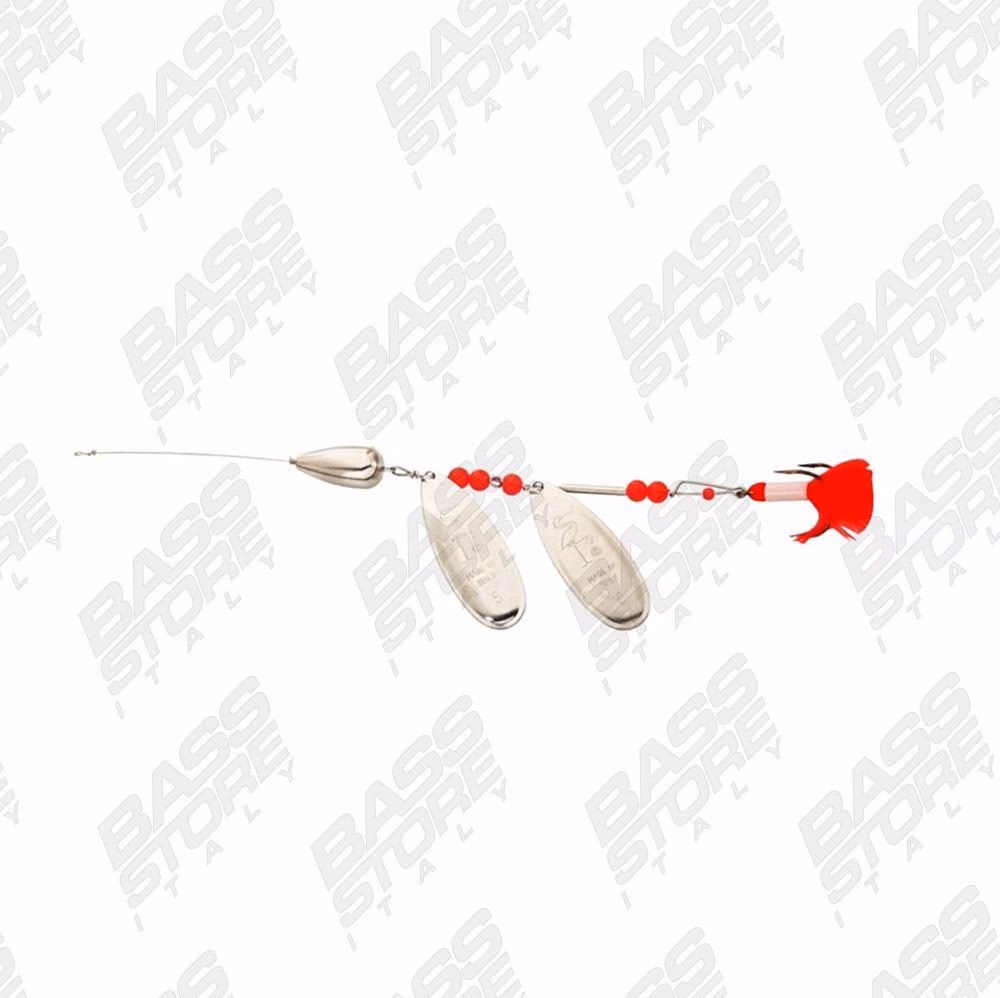 Cucharas tándem giratorias Heron Mantide ideales para la pesca del lucio. Esta cuchara giratoria tándem, como todas las cucharas giratorias Heron, está fabricada en Italia.