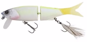 Jackall Bros Maekon Jr. El nuevo swimbait de Jackall Bros con el innovador sistema Monoflex Joint, en el que la articulación está formada por un único eslabón giratorio que proporciona al señuelo una amplia movilidad seccional, lo que le confiere una acción única. El Maekon 150SF swimbait ha sido creado para responder a dos recuperaciones principales: la primera es un 'walking the dog' bajo el agua, mientras que la segunda es una recuperación lineal natural. Tiene un "cuerpo lateral plano" que permite mover mucha agua con el primer tipo de recuperación y reducir la resistencia en el agua cuando se recupera linealmente. Cuando no utilice el swimbait, es aconsejable cubrir la cola con el blister que se suministra en la caja para evitar daños. De las dos anclas, sólo la trasera está vestida: esta elección se hizo específicamente para frenar el cebo minimizando la distancia de movimiento bajo el agua. La pala, muy fina, permite nadar a profundidades de 1,2 m.