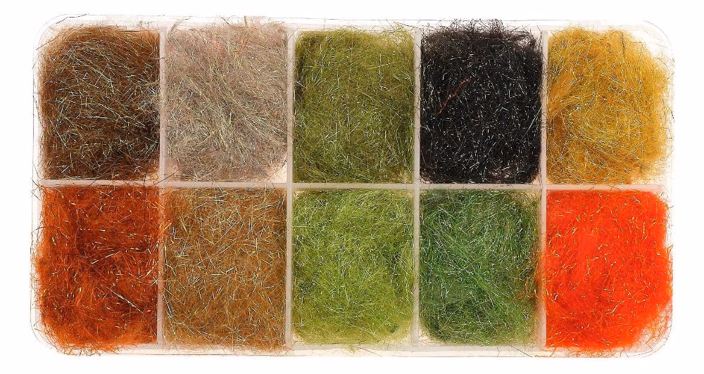 Fibras Angelina y pelo de liebre para Dubbing Fibras metalizadas de pelo de angelina y liebre para la construcción de moscas Se trata de un material excelente para streamers de varios tamaños, que también puede utilizarse como dubbing o mezclarse para dar color al dubbing natural. También es excelente para construir cuerpos y torsos con reflejos muy atractivos.