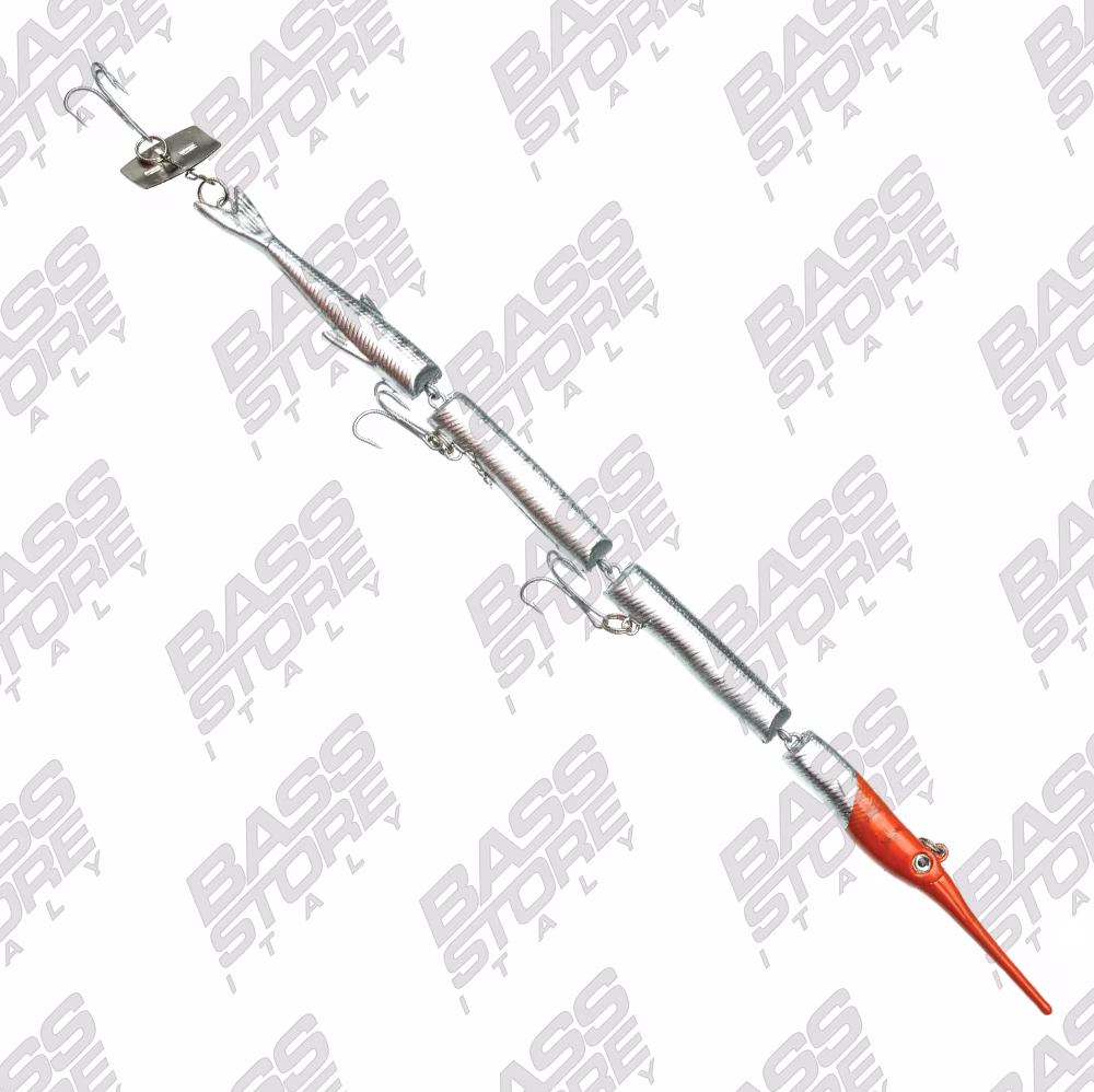 El Aguglia Take es un señuelo con cuerpo multiarticulado. Imita una de las presas favoritas del trofeo Lubina, Barracuda, Pescado Azul. Cuenta con herrajes de acero inoxidable y ganchos triples resistentes a la corrosión.