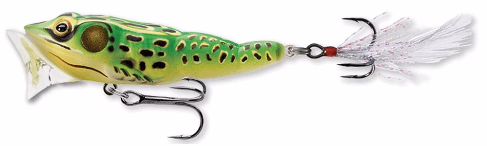 Señuelo Livetarget Frog Popper: pesquelo a través de pistas abiertas, alrededor de coberturas pesadas y cerca de la pendiente. Este popper, que es una imitación de una rana real, fue diseñado para "escupir" y "hacer estallar" en la superficie cuando se apunta a lobina negra, perca y lucio. Este señuelo vuela una milla de distancia y tiene un excelente sonido de "blooping". Gancho de cola emplumado. Ganador de la categoría de señuelo ICAST "Best of Show"