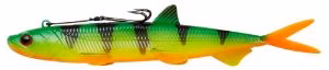 SEÑUELO PARA GATOS PELÁGICOS Madcat La caza de bagres pelágicos ahora es mucho más fácil con este señuelo blando súper realista e increíblemente detallado, especialmente diseñado para ese propósito. Con una correa oculta dentro de la cabeza para no asustar al cansado bagre, este señuelo cae rápido, nada recto como una flecha y cuelga horizontalmente en la zona de impacto. El gancho doble superfuerte 6X se mantiene en su lugar con un pequeño gancho magnético integrado. El bagre y, a veces, la lucioperca golpean este señuelo con tanta fuerza y profundidad que desengancharlo puede resultar complicado: este anzuelo doble no se pega al cuerpo del señuelo, lo que hace que el desenganche sea más rápido y más amigable para los peces. El señuelo también cuenta con un aroma añadido para atraer al bagre desde más lejos.