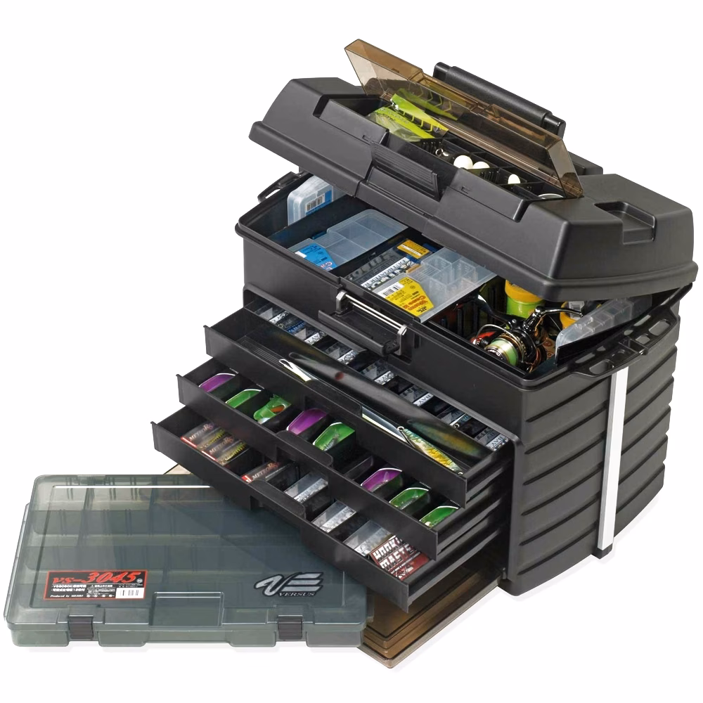 Meiho Versus VS-8050 Tackle Box. Do you have a bunch of fishing tackle and supplies that you need to store in your garage or shed? Or maybe you have a big trip coming up and you just want to be prepared. Well then you stumbled upon the right page as the VS-8050 tackle box is for you! This large plastic fishing storage case breaks down into 3 sections. The first is a small quick access area inside the lid that has 4 fixed dividers and 4 removable ones. This area is great for anything you might need to grab quickly like hooks, weights or bait. The next is larger storage area inside the case itself. This storage space is good for your larger items or fishing lures as it has 7 removable dividers and 4 with hook notches so you can hang your lures and rigs. Finally we get to the drawers. There are 4 pull out drawers in the front of the tackle case that each have a variation of fixed and removable dividers so you can truly customize your storage areas. With all of this, the VS-8050 also has a comfortable carrying handle and several closing latches that keep all the compartments closed during transport.
