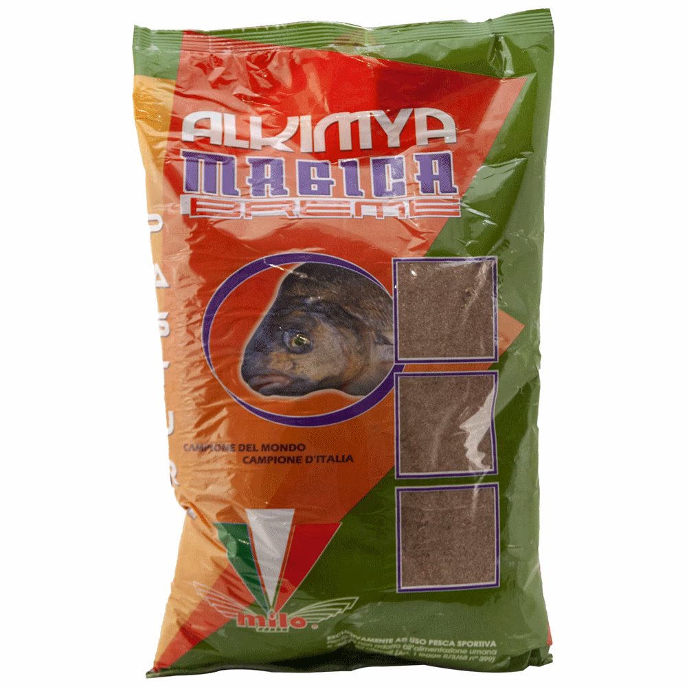 Milo Alkimya Magic Bream Engodo. Engodo molido de grano medio/fino con un alto grado de sabor a caramelo que lo hace principalmente adecuado para la pesca de la dorada. También es excelente para carpas grandes, tencas y gardones. Disponible en dos versiones que se diferencian por la compacidad de los ingredientes. La versión Dark, que se caracteriza por una pegajosidad pronunciada, se recomienda para la pesca en condiciones de corriente media a rápida, para cebos pesados iniciales y para la pesca con feeder. La versión Light se recomienda para corrientes medianamente lentas o tranquilas y para la pesca de investigación. Se aconseja añadir una dosis equivalente de terre de somme, con aguas tranquilas o lentas, o de terre de riviere, con aguas rápidas, para mantener la vitalidad del fouilles.