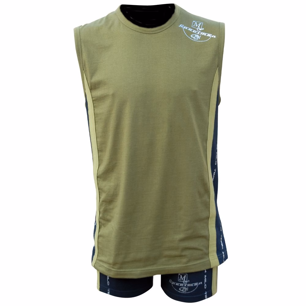 Milo Completo Intimo David, linea di abbigliamento intimo per pescatori, con design "confort-fit" composta da canotta in cotone 100% giro collo più boxer parigamba. La canotta è a spalla larga con inserti neri laterali a contrasto, sui quali è stampata in argento la scritta verticale "Team Milo". I boxer sono di colore nero. Ottima idea regalo per pescatori.
