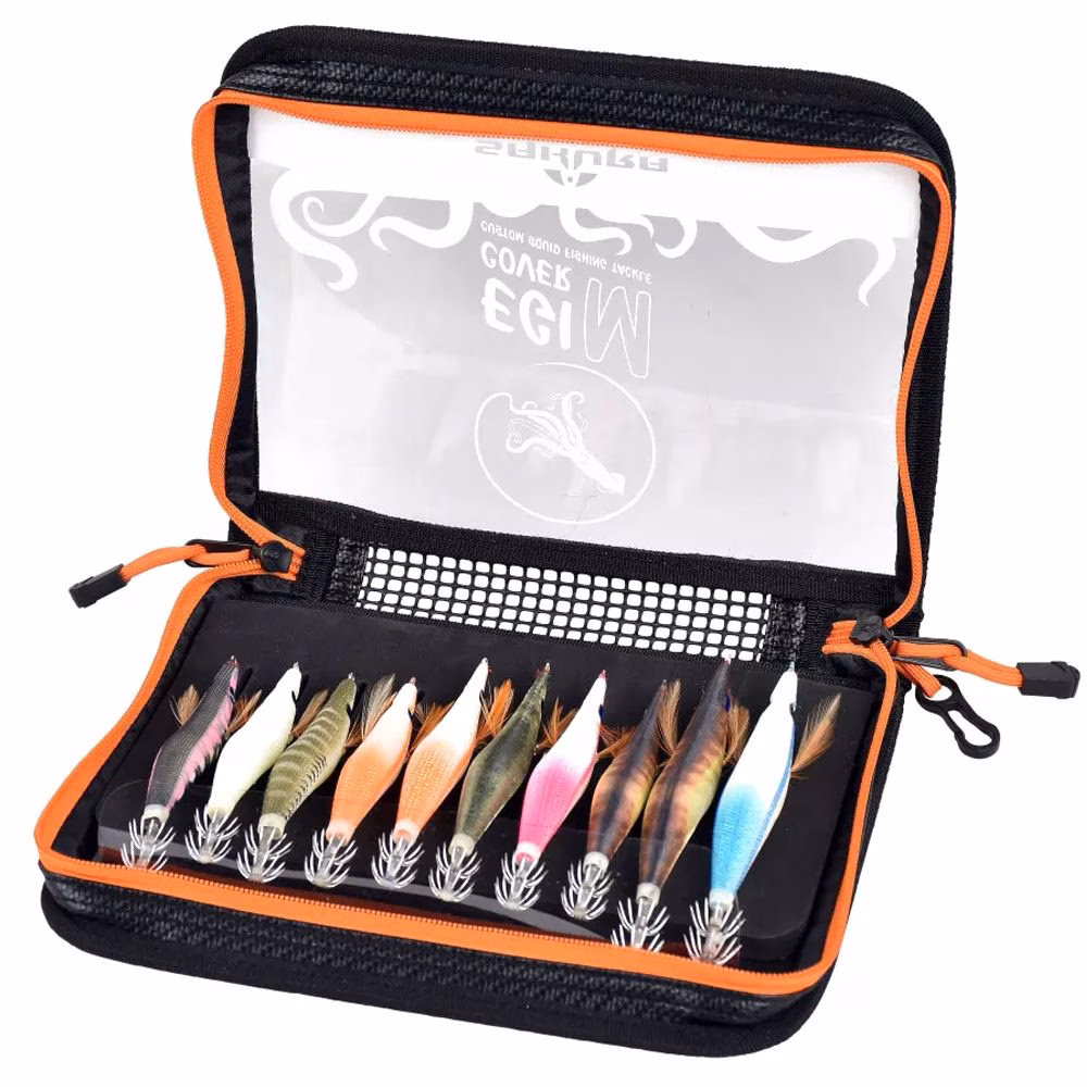 l estuche para plantillas Sakura Egi Cover está disponible en 3 tamaños. Diseñado para guardar las plantillas (también conocidas como calamaretas), este estuche tiene una tapa rígida y transparente que es ideal para mantener un ojo en su contenido sin tener que abrirlo. Además, Sakura ha añadido una rejilla de ventilación en la parte posterior del maletín para proteger las plantillas de la corrosión. Esta ventilación permite que las plantillas se sequen rápidamente sin oxidarse. Para evitar pincharte y proteger los anzuelos de los jigs, este kit tiene una solapa que se coloca justo encima de la anilla del anzuelo. Según el tamaño que elijas, tendrás 6, 10 ó 12 ranuras para jigs. Además, este kit compacto puede engancharse al cinturón o a la mochila gracias a un mosquetón integrado, o guardarse en la mochila.