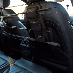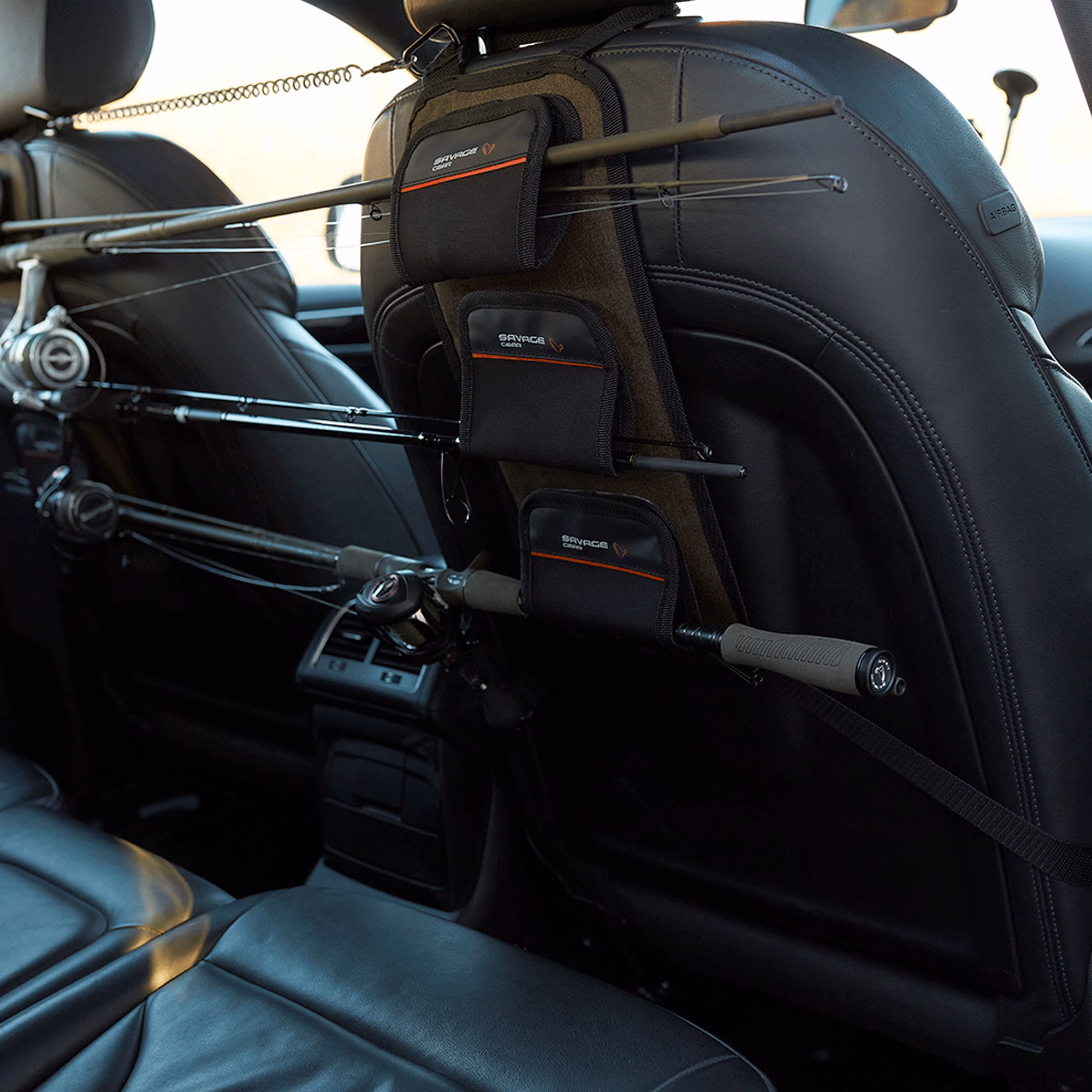 Soporte para varillas de juego de coche. La manera perfecta de transportar sus cañas en el automóvil, este portacañas puede contener hasta tres cañas montadas. Se suministra con una fuerte bobina que puede funcionar entre los asientos o en el techo para sostener varillas aún más largas.