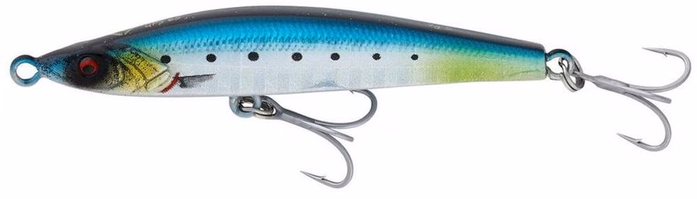 Savage Gear Gravity Pencil Slim, un minnow lipless hundible que, gracias a su perfil hidrodinámico, permite el movimiento de lado a lado bajo la superficie del agua o, mediante una recogida rápida y brusca, puede simular un pez forrajero en dificultades. La plomada ha sido calibrada para acentuar la acción de "ROLLING" mientras se mantiene una postura horizontal, con el fin de aumentar las tasas de picada ya en los primeros segundos después de entrar en el agua. Puede utilizarse en aguas extremadamente poco profundas y, gracias a su acción "wobbling", también resultará eficaz en zonas con gran presión de pesca. Ideal para lubinas, caballas, garrofas y atunes.