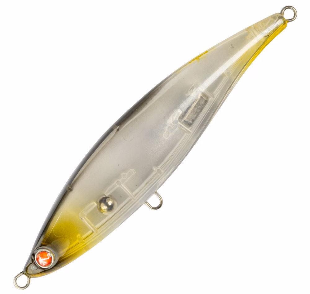 Cebo tipo lápiz flotante sin labios. Estructura ABS - Largo: 107 mm – Peso: 19 g. Profundidad de natación: 0-50 cm Mediante armadura y anclajes reforzados resistentes a la corrosión marina 3X, n°2 #4 Meneando la cola nadando justo debajo de la superficie con pausas para recuperar la superficie. Diseñado específicamente para la pesca de lubina en ambientes lagunares y costeros, pero válido para todos los depredadores mediterráneos