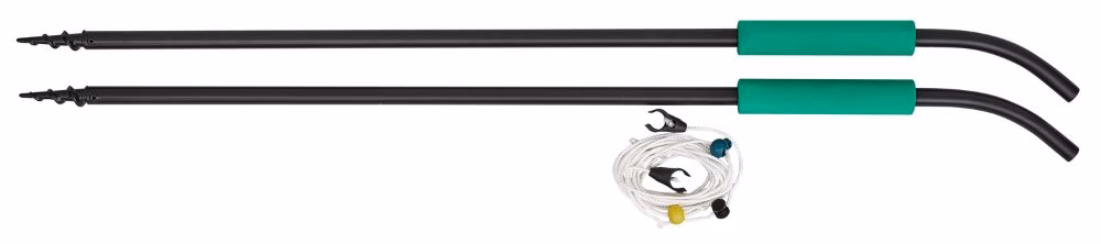 Dos Piquetas Robustas (Distance Sticks): Los dos postes son robustos y terminan con una punta de tornillo o barrena (para fijarlos firmemente en el suelo). Los mangos superiores, de EVA Foam (el material verde en la imagen), sirven para enrollar el hilo.