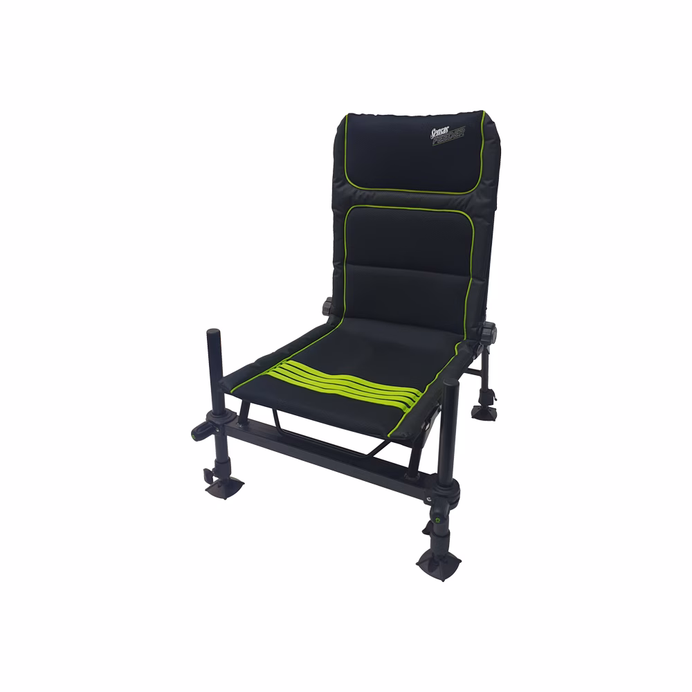 Sensas Feeder Chair, Ultra-comfortable chair with two telescopic rear legs and two 36mm forward legs to suit any type of bank. Side trays, accessories and rests can be attached easily to the legs