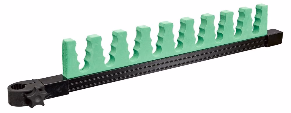 TOPSETSTEUN JUMBO UNIVERSEEL Topsetsteun waar dankzij het speciale design zowel 3-, 4- als 5-delige topsets een plekje vinden. Ongeacht de lengte kunnen alle topsets op één steun worden geplaatst: van korte sets voor het alveren tot en met 5-delige sets voor het vissen op de lange afstand. Heel handig!