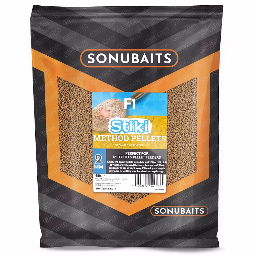 Pellets de método pegajoso Sonubaits F1. Si utiliza el Method Feeder, debe asegurarse de que los gránulos permanezcan en el alimentador a través del yeso, impacten el agua y caigan al fondo antes de que se salgan del alimentador y revelen el anzuelo. Los pellets F1 Stiki Method han sido tratados con un aglutinante especial que se activa cuando entra en contacto con el agua y hace que los pellets se adhieran entre sí y al Method Feeder. Debido a la pequeña cantidad de agua necesaria para activarlos, significa que los gránulos permanecen lo suficientemente duros como para que puedan compactarse fácilmente en un Method Feeder y puede estar seguro de que permanecerán durante todo el lanzamiento, pero tan pronto como lleguen al fondo, lo harán. empiezan a soltarse del alimentador.
